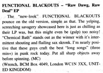 “There are times - tho they are few and far between - where I'll plug a CD in to my player and I will be left completely and utterly gobsmacked. This my dear readers, is one of those times. Chicago's own sons of real bad behavior, the Functional Blackouts are a cantankerous, noisy, trebly, wickedly inventive punk rock band, with a strong emphasis on the word punk. Pure punk. Had this band been hanging around in 1978, I can assure you, with all the confidence I can muster, that record collectors would literally be jumping over each other at record swaps to find their stuff today. Killed by Death for the modern age.”