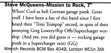Before this, the Steve McQueens have released two singles and two LPs, including their classic debut "Got A Mission" LP. "Mission To Rock" is available from Wrench Records mailorder. The Steve McQueens have also released a second album "We Sell Millions Nationwide" - worth checking out!!